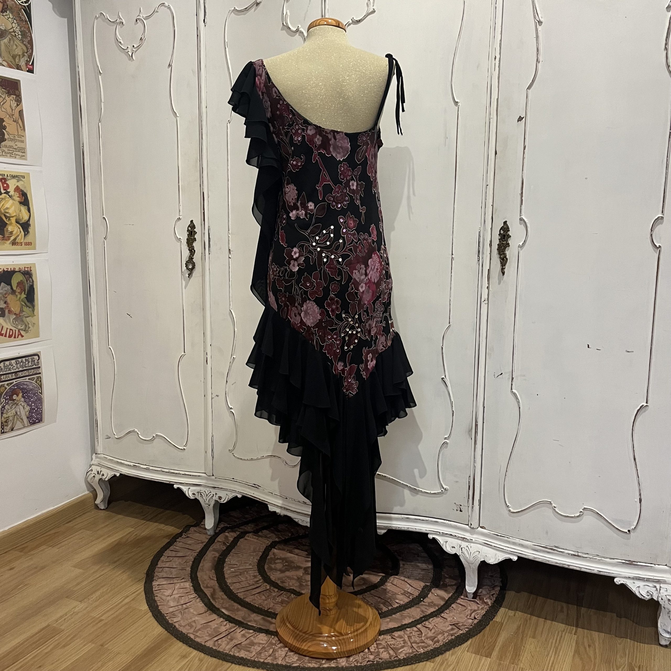Lyra is an enchanting asymmetrical dress that combines elegance and movement in every detail. Made from a luxurious 60% silk fabric, it features a deep black base adorned with pink and wine floral embroidery and sequins. One adjustable shoulder strap and cascading chiffon ruffles add a touch of drama and femininity to this unique piece. Fully lined for comfort and structure.